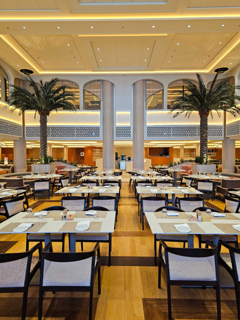 Am navigat cu AROYA Cruises, o companie relativ nouă, lansată în 2024, dedicată, în special, publicului arab. Vasul are o capacitate de 3.500 de pasageri, însă în croaziera noastră erau la bord doar 1.300. Atmosfera a fost mult mai aerisită și liniștită, iar serviciile mai personalizate. Raportul pasageri–echipaj a fost impresionant: 1.300 de pasageri și 1.200 de angajați. Totul era impecabil, de la designul modern până la atenția pentru detalii.